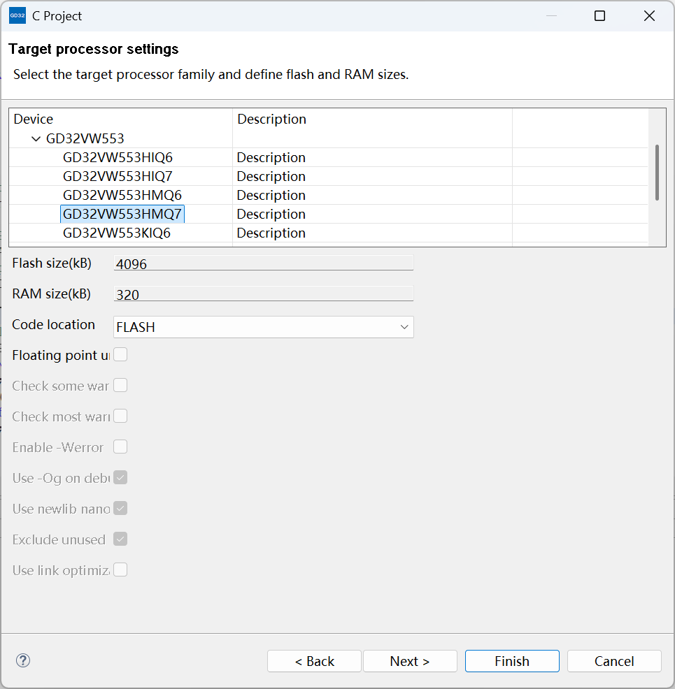然后选择芯片型号,这里选择GD32VW553HMQ7