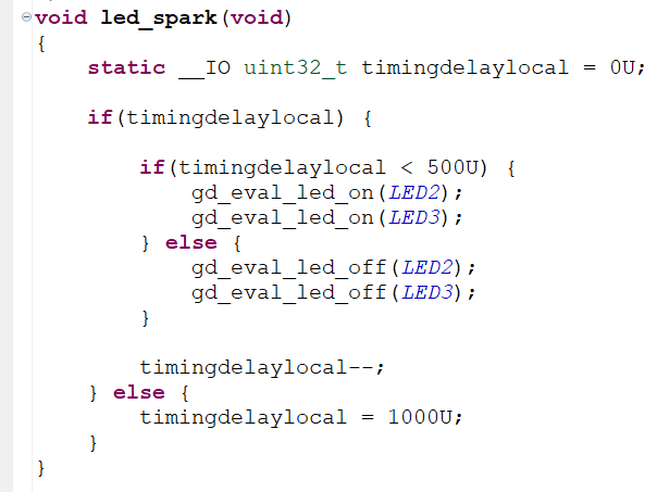 3.当timingdelaylocal大于0时,如果其值小于500,则调用gd_eval_led_on(LED2);和gd_eval_led_on(LED3);点亮LED2和LED3;否则调用gd_eval_led_off(LED2);和gd_eval_led_off(LED3);熄灭LED2和LED3。