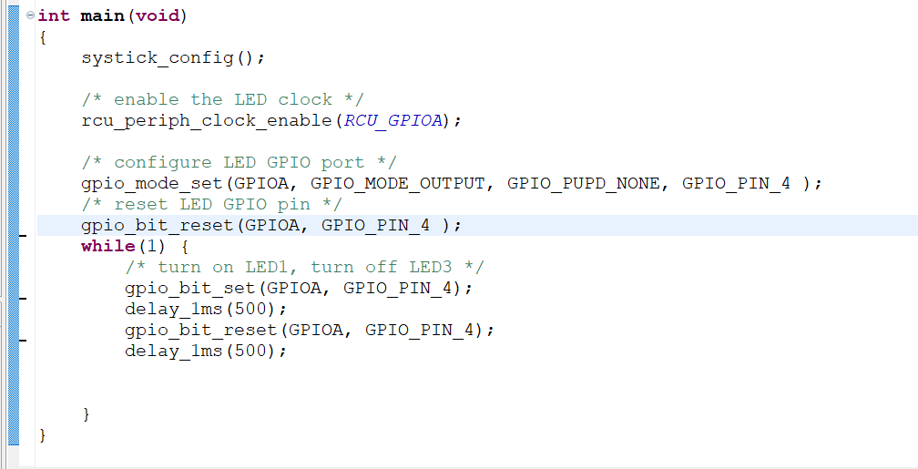 8.如果再次检测到按键处于按下状态(SET),则调用gd_eval_led_toggle(LED1);来切换LED1的亮灭状态。
