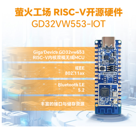 中电港萤火工场推出基于兆易创新(GigaDevice)GD32VW553——一款RISC-V内核的32位MCU的开源硬件板GD32VW553-IOT。该板集成了主控芯片卓越的无线连接能力、强大的性能与能效比以及丰富的外设接口,可享受到开源社区带来的丰富资源和便利,极大地方便了开发者的快速部署和应用创新。
