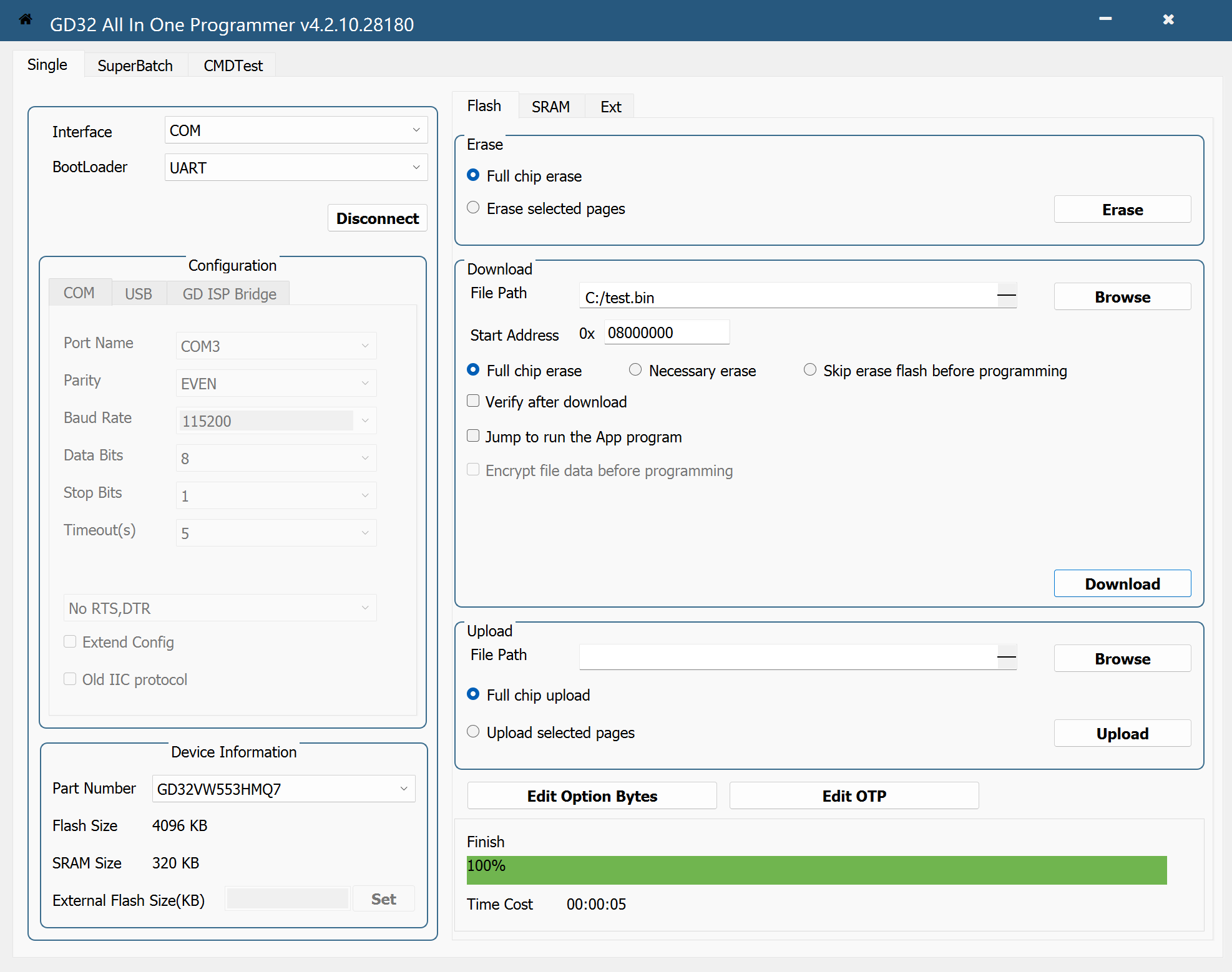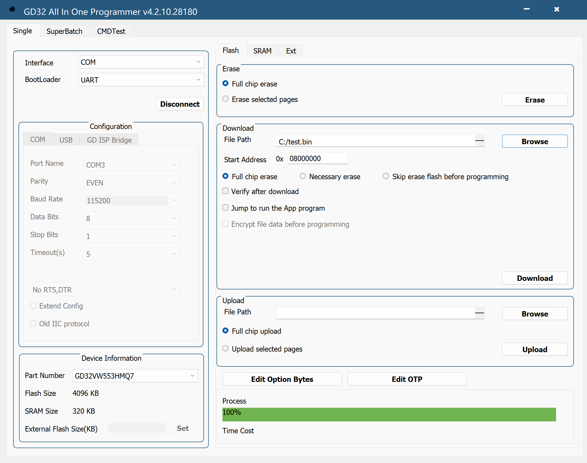 买来USB转TTL模块,看着网上的教程接了线,套了跳线帽,却发现使用官方的串口烧录工具GD32 All In One Programmer怎么也识别不到设备。准确来说,是COM口识别到了,但与设备的通信出现问题:每次点一下Connect按钮,过两三秒就会弹出设备没有回应的错误提示,令我头大。