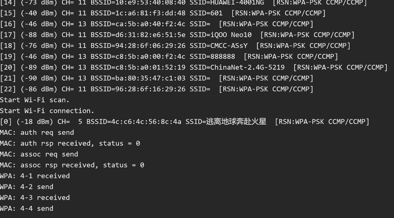 这里主要是使用wifi_management_scan 扫描周围WiFi 再使用wifi_netlink_scan_results_print 打印最后使用 wifi_management_scan进行连接