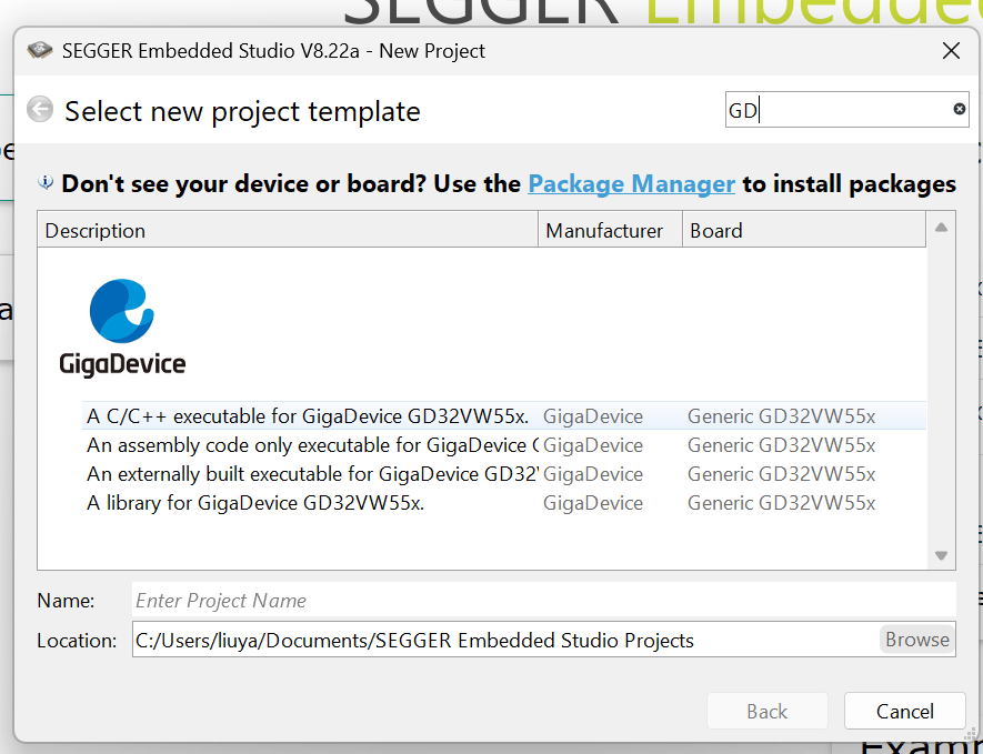 3、搜索GD,然后选择第一个选项,下面填写项目名,选择保存地址。