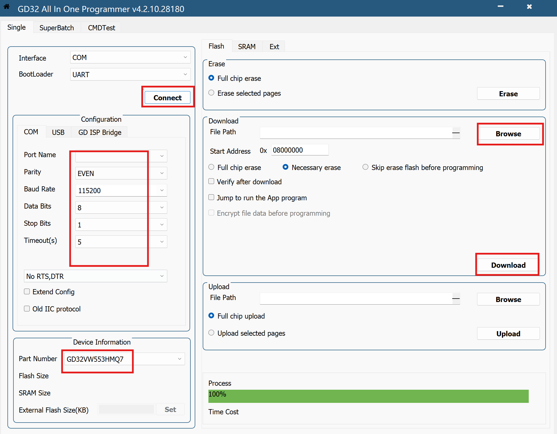 程序烧录直接用TTL转USB,下载GD32 All In One Programmer,RX/TX引脚参考一下原理图,连接后打开添加bin文件下载即可(不知道是我电脑的原因还是啥原因,连接不好连接老是连接不上,而且连续下载时概率性下载不上)