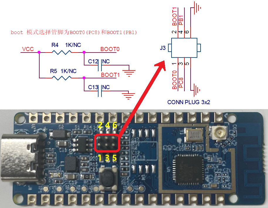 结合上面的部分原理图可知,boot0拉高时与R4电阻相连,而板上实物并没有焊接该1KΩ电阻,因此进入bootloader需要手动将boot0拉高,即使用一根杜邦线将PC8与3V3短接,或者镊子短接。硬件实物连接如下: