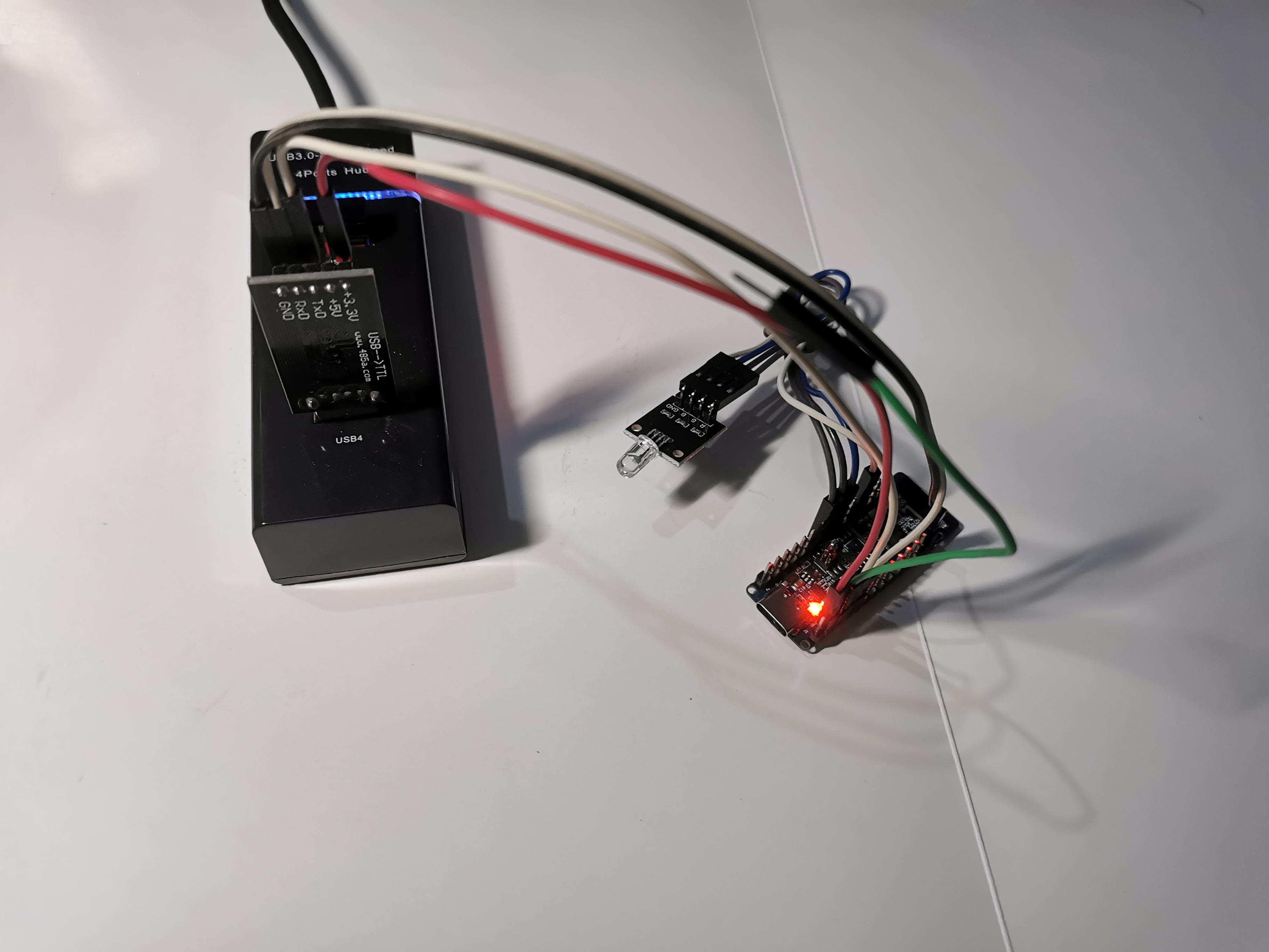 收到的GD32VW553-IOT开发板两边的管脚是没焊接插针的,因此需要先手动焊接好2.54mm插针,当然焊插座也行。至于排针靠正面焊接还是靠底面焊接,根据个人需要吧,怎么方便怎么来。这里笔者将插针焊接在底面,正面可使用杜邦线直连针脚;如若将插针焊接在正面,使用底面上的排针接入面包板中,也是比较方便的。排针焊好后,下载程序需要采用串口调试工具,即USB转TTL模块。还有准备一块共阴极的RGB灯板模块。