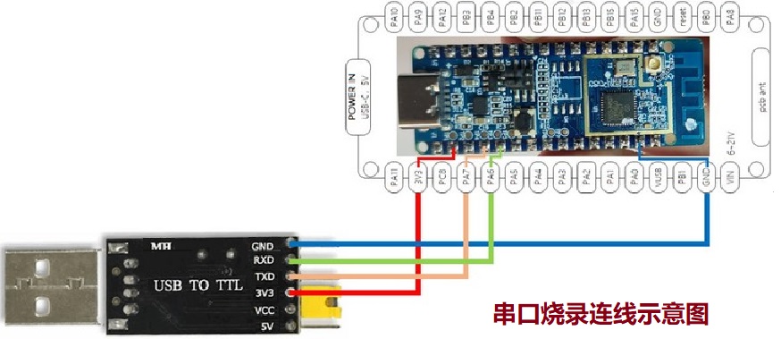 打开“GD32AllInOneProgrammer.exe”烧录软件,设置J3跳线帽,将PC8与3V3短接,使板子进入bootloader阶段。硬件连线示意图如下: