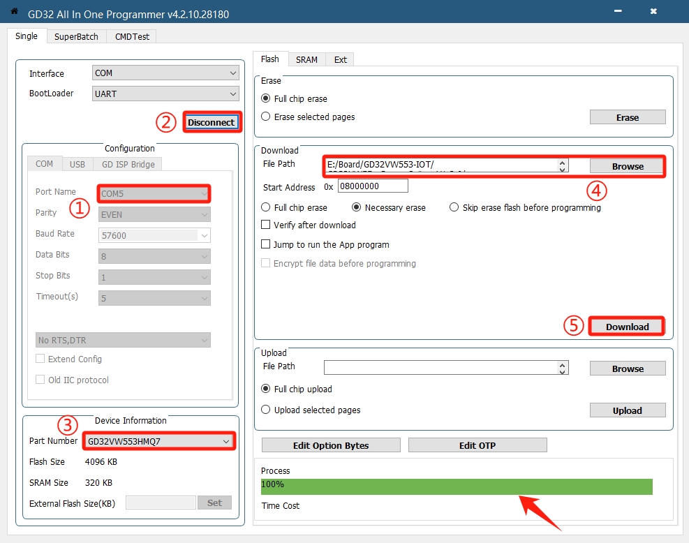接着在烧录软件中选择串口模块烧写,连接好当前的串口号,选择对应的设备型号,加载刚才编译完成后生成的hex文件,最后点击“Download”即可完成程序烧录。