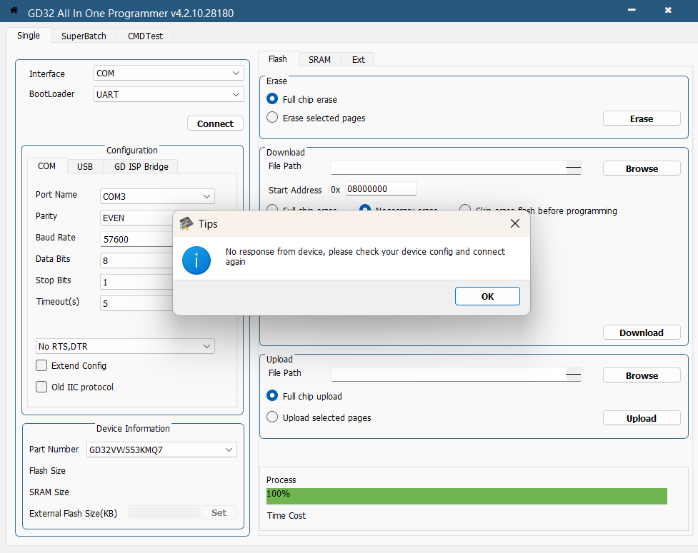 通过GD32AllInOneProgrammer软件刷新固件,因为手上没有usb to ttl芯片,想尝试通过原来的开发板上的ch340芯片上传,