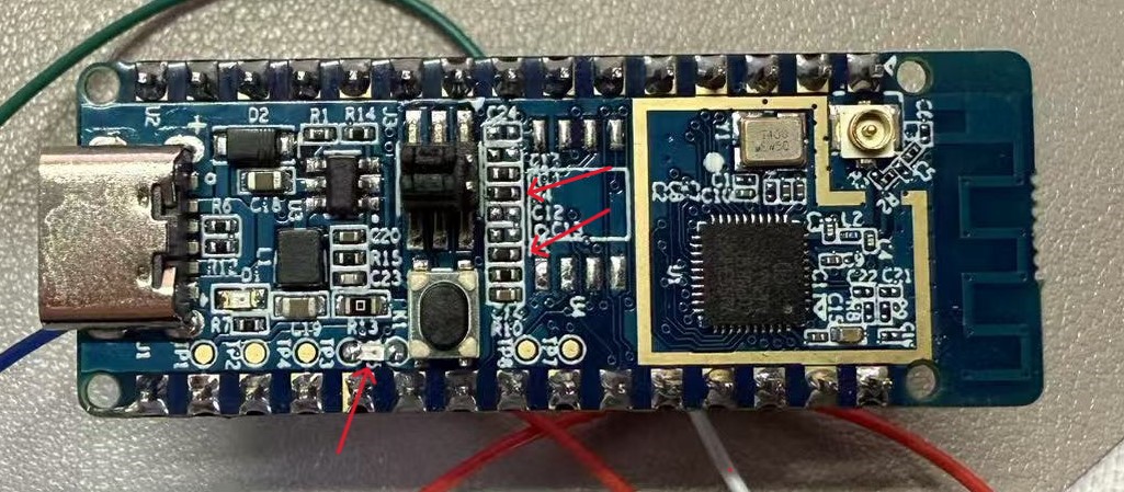 从上面原理图中可以发现BOOT切换电路上的上拉电阻R4和R5标注NC没有焊接,所以在准备测试之前需要将这两个地方补上电阻或者焊接连接上。另外一个就是没有发现可供编程点亮的LED灯,在查看原理图的引脚电路和板子实物上面的布局后最终选择TP3和TP5两个触电间焊接一颗0603的LED贴片。最终处理如下图。