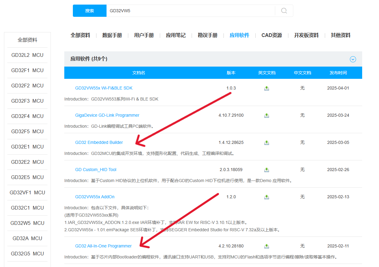 从官方给出的快速开发指南中发现,在开发之前需要下载编译工具和下载烧录工具,可以直接去兆易创新官网寻找,下载如下两个个工具。这两个工具都不需要安装。