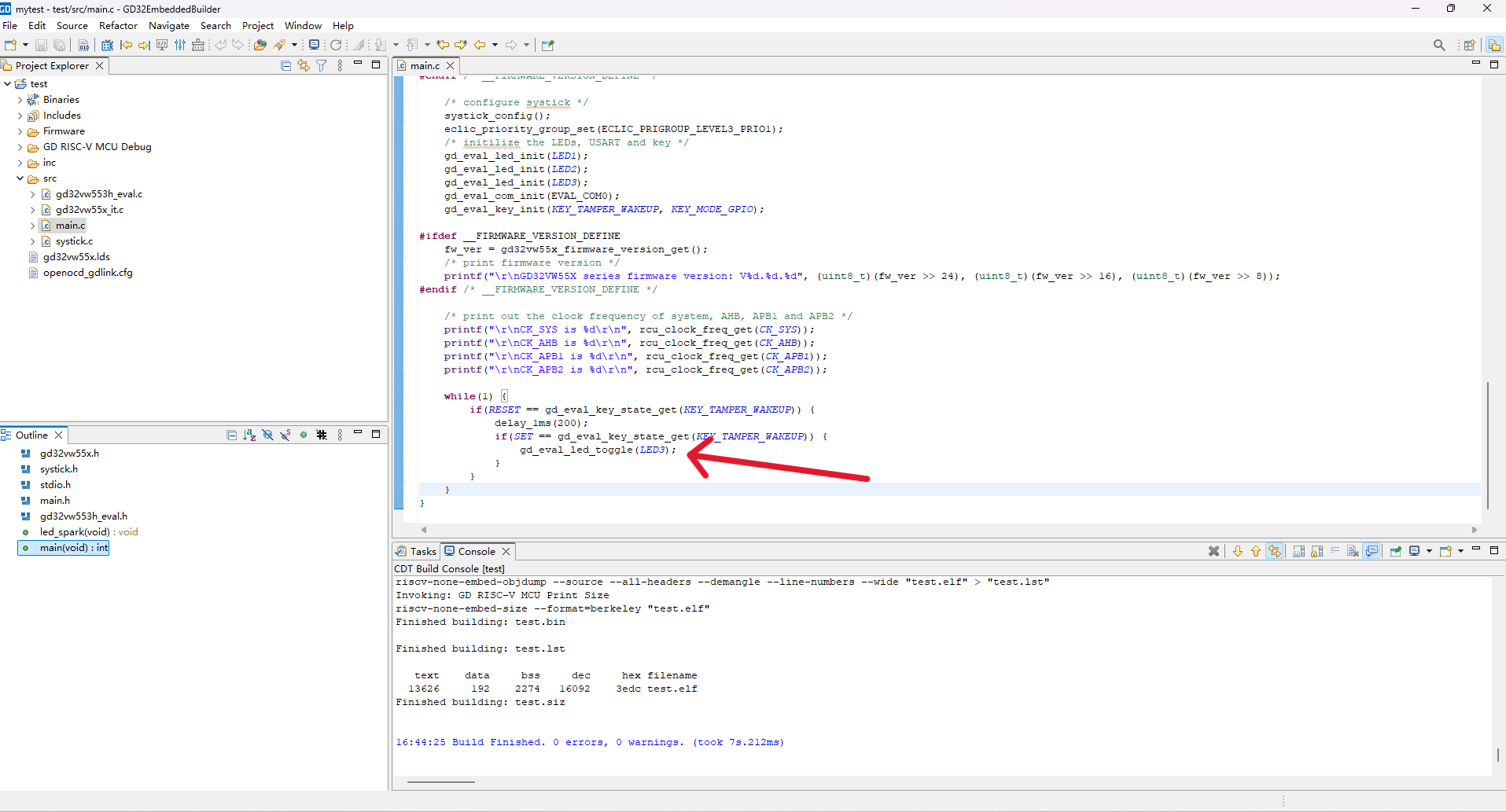 打开编译工具GD32 Embedded Builder IDE创建一个工程->选择C Project -> 选择GD32VW553HMQ7芯片,然后创建了一个默认项目,这里main.c中已经有点灯示例程序,这里只需将我们焊接的LED灯的IO引脚修改为PA6。就是默认程序的LED3。