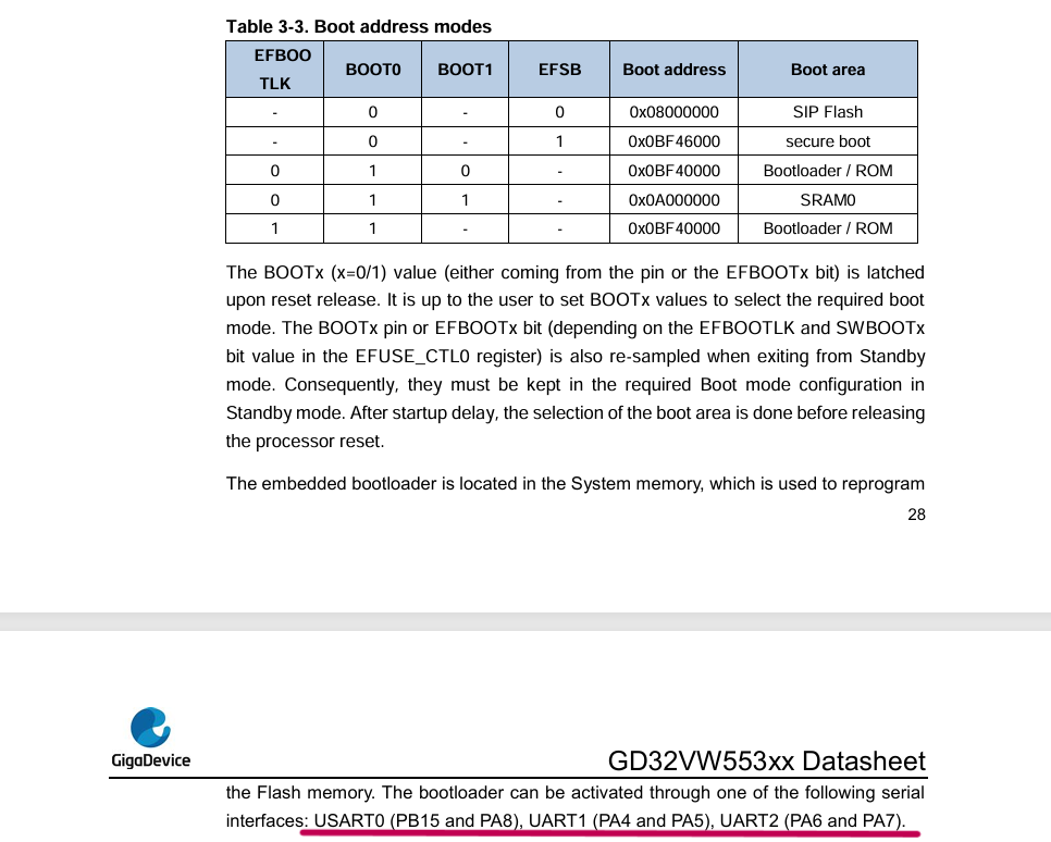 编译完成生成bin文件就用GD32 All In One Programmer工具下载,这里是串口下载,从芯片手册中可以发现,给出的串口下载口图下图,这里测试使用USART0的PB15和PA8引脚。