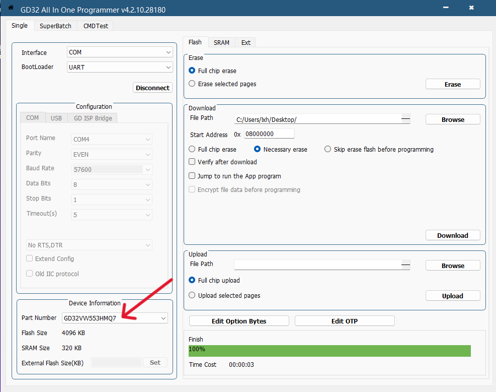 接着就是下载了,在下载前将BOOT0拉高,下载完成后接着将跳线帽拉低,在烧录工具中同样需要选择芯片型号进行连接下载。
