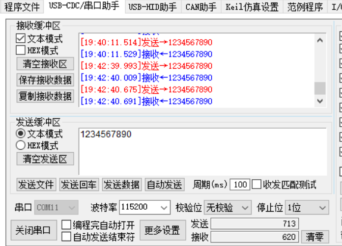 5.程序效果:串口发送10个字节的数据,返回所有数据