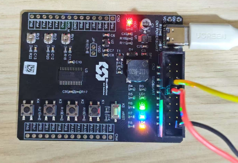 开发板做工精致,板载一个声音悦耳(很大声)的实用蜂鸣器。使用Type C供电和USB串口,LED灯还采用了4种颜色,可以说十分用心了,远超某原子。