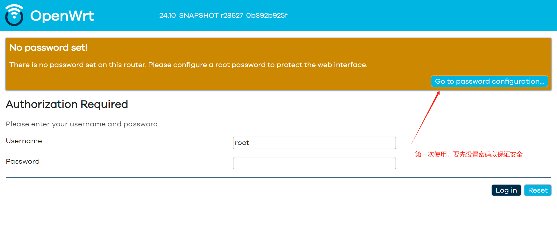 将卡插入到板子中,接通电源,就可以启动 openwrt 了。将电脑用网线连接开发板,然后使用浏览器访问 192.168.1.1 ,如果一切正常,就会看到如下页面。