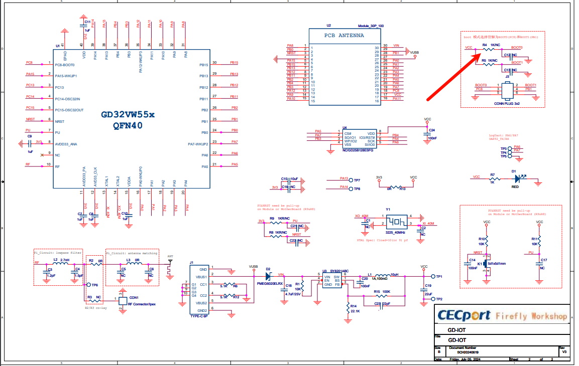 看了下原理图和用户手册要使MCU进入Bootloader模式,需要将Boot0配置为高电平,Boot1为低电平,但由于开发板实物中的R4位置的1K电阻并未焊接,我们要自己焊接一个1k的电阻或者直接短接,Boot0和Boot1跳线帽要连接正确,需注意,在烧录完成后需要将boot0置于boot1相同位置。