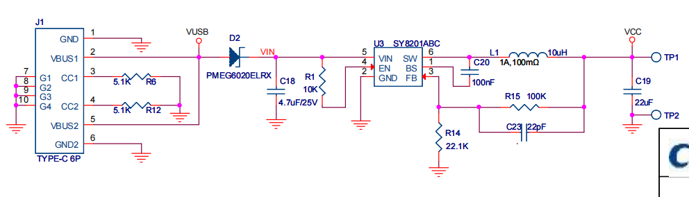 typeC 供电,CC1、CC2接5.1K电阻能从适配器取电5V 3A,经过汐力杰DC-DC同步降压芯片输出3.3V 1A,我觉得D2这个肖特基二极管完全可以去掉,有压降,损耗高