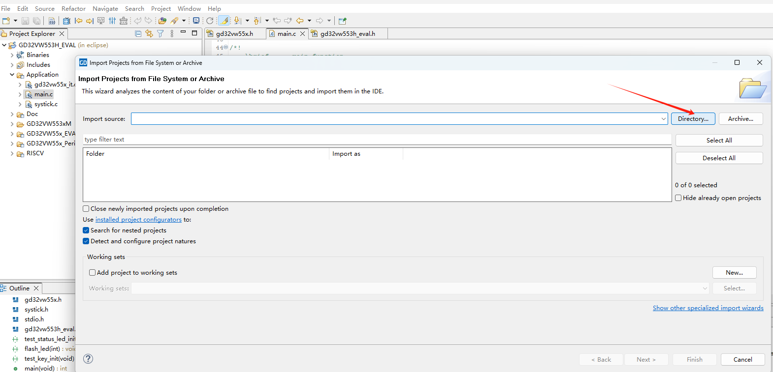 2.1打开GD32EmbeddedBuilder软件,按下图导入例程