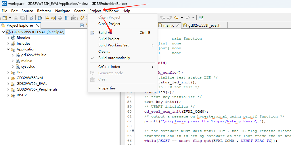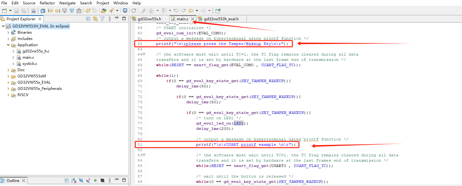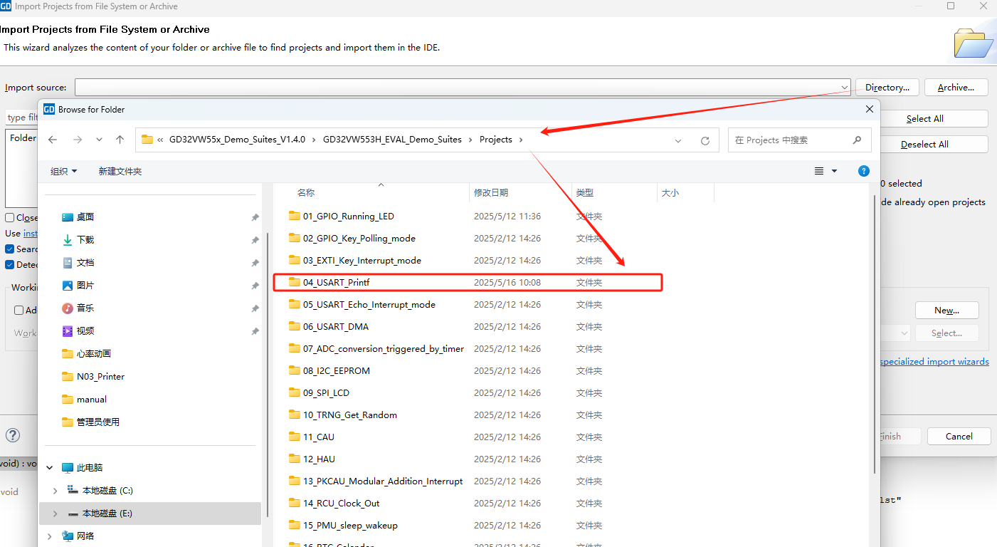 2.2 选择官方例程目录GD32VW55x_Demo_Suites_V1.4.0\GD32VW553H_EVAL_Demo_Suites\Projects\04_USART_Printf
