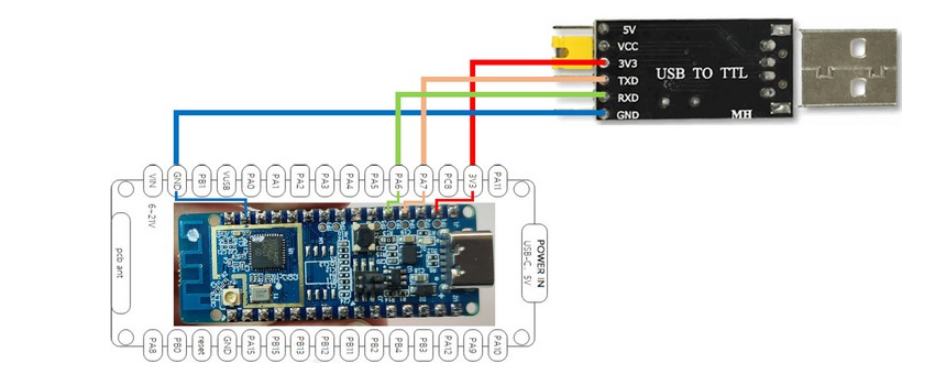 4.2 将串口助手的TX和RX脚按下图连接到开发板的UART0上。