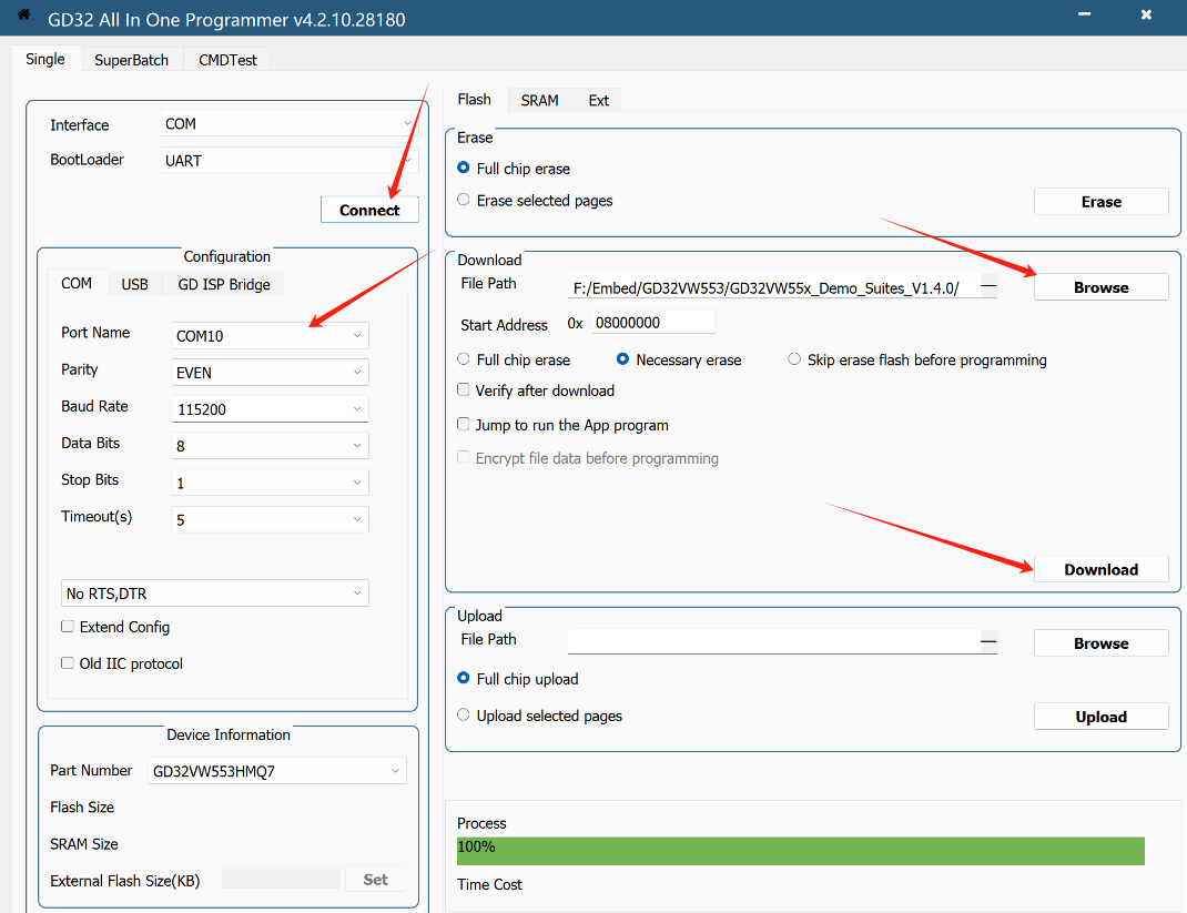 3.4 选择端口号,并在右侧download中加载上面编译好的bin文件(路径 .../GD32VW55x_Demo_Suites_V1.4.0/GD32VW553H_EVAL_Demo_Suites/Projects/04_USART_Printf/eclipse/GD32VW553xM/GD32VW553H_EVAL.bin),然后点击download即可将bin文件下载到开发板中。