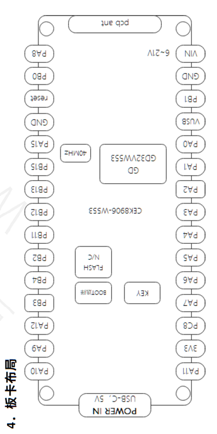 硬件规格书6页,第4页板卡布局有用。这个布局图把usb电压输入朝上不符合我的习惯。从后面的电路图来看他也是放反了,我还是把它反过来吧。没法看了。以后面原理图为准。