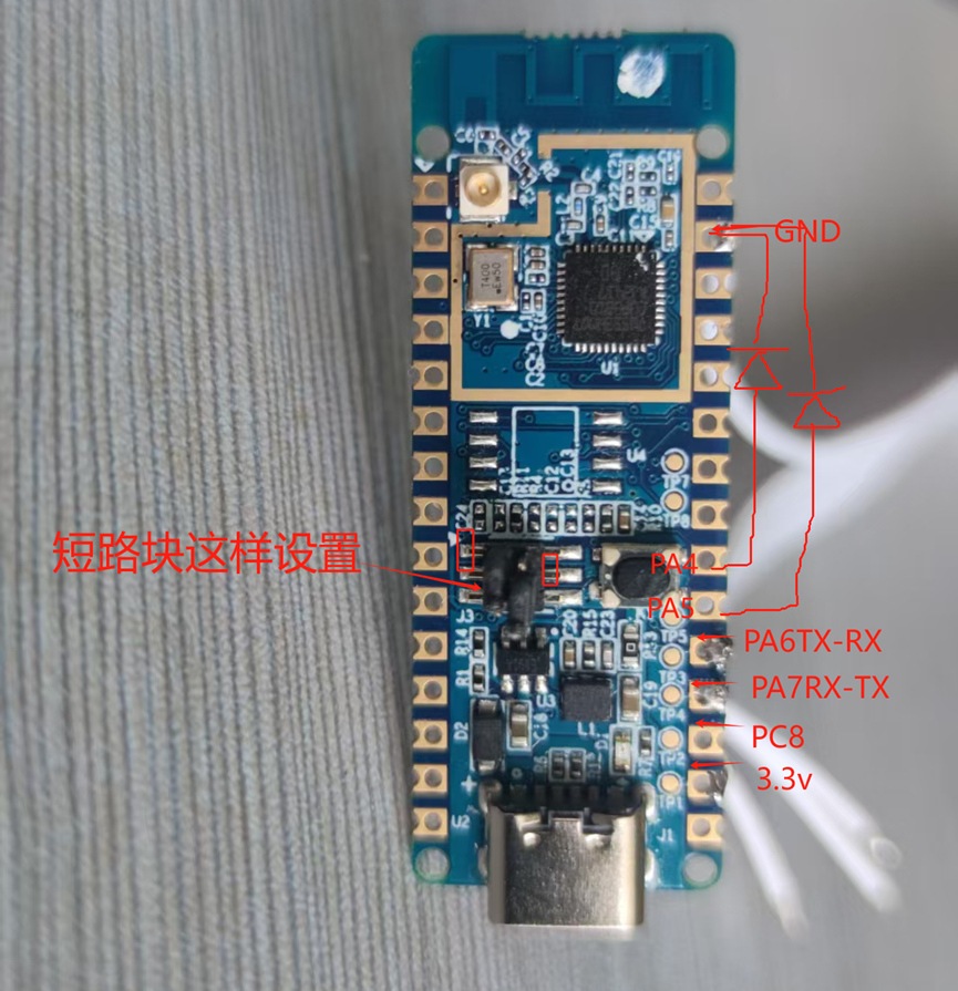 第三坑:为啥标出PC8,因为这个开发板留了坑,连好线没法握手,R4没有焊接。0402的电阻搞不定。看那个跳线BOOT0是要连PC8的,也就是说PC8和BOOT0通过R4接3.3v,那引脚pc8旁边刚好是3.3v,直接铜丝穿孔绑起来,正常了。但是芯片有点发热,先断电,等烧录程序时再插上,一共几秒钟,应该没问题。