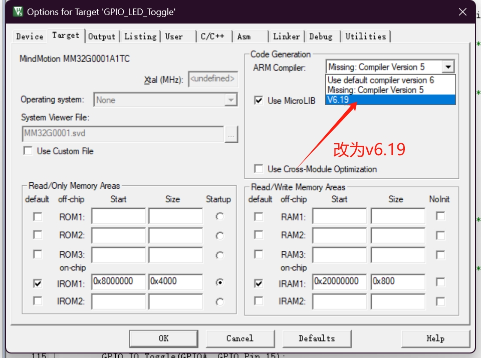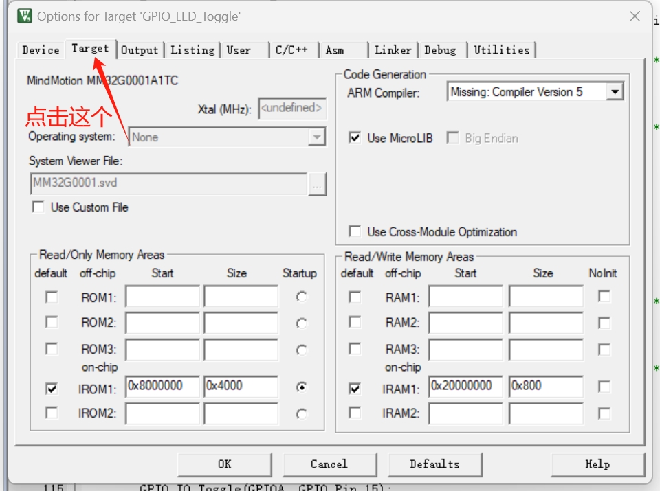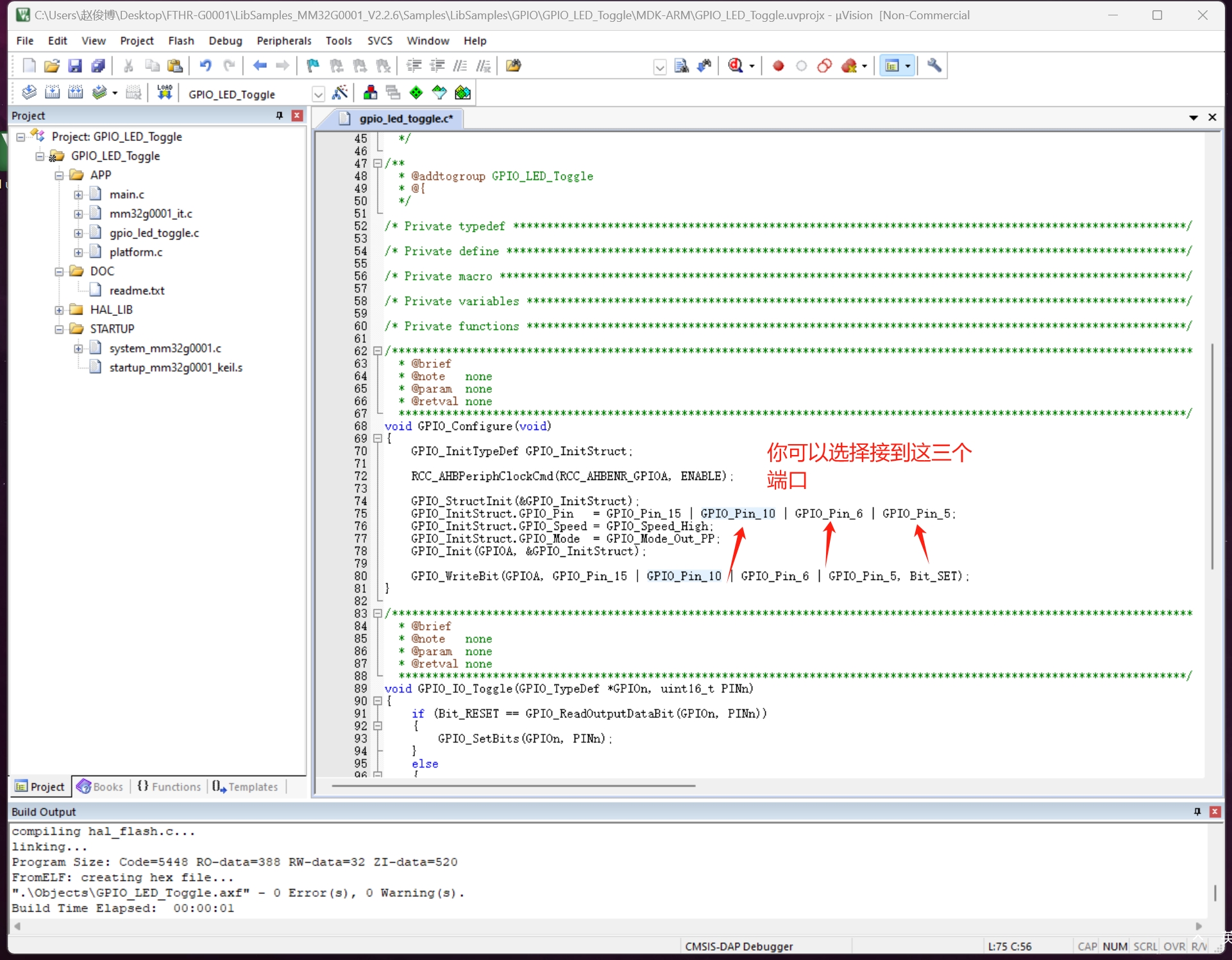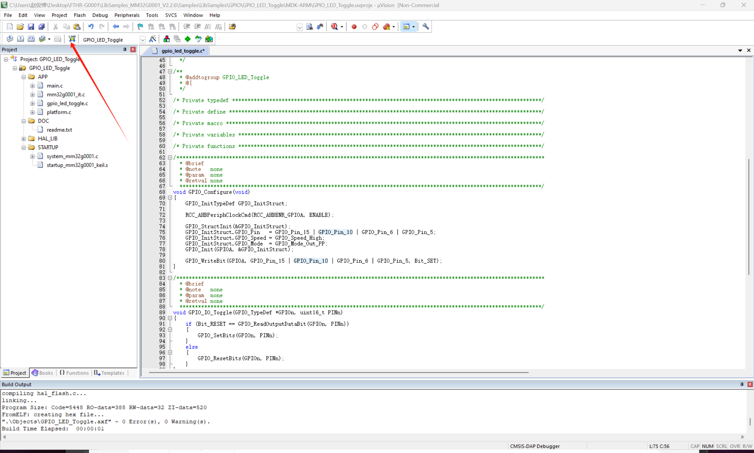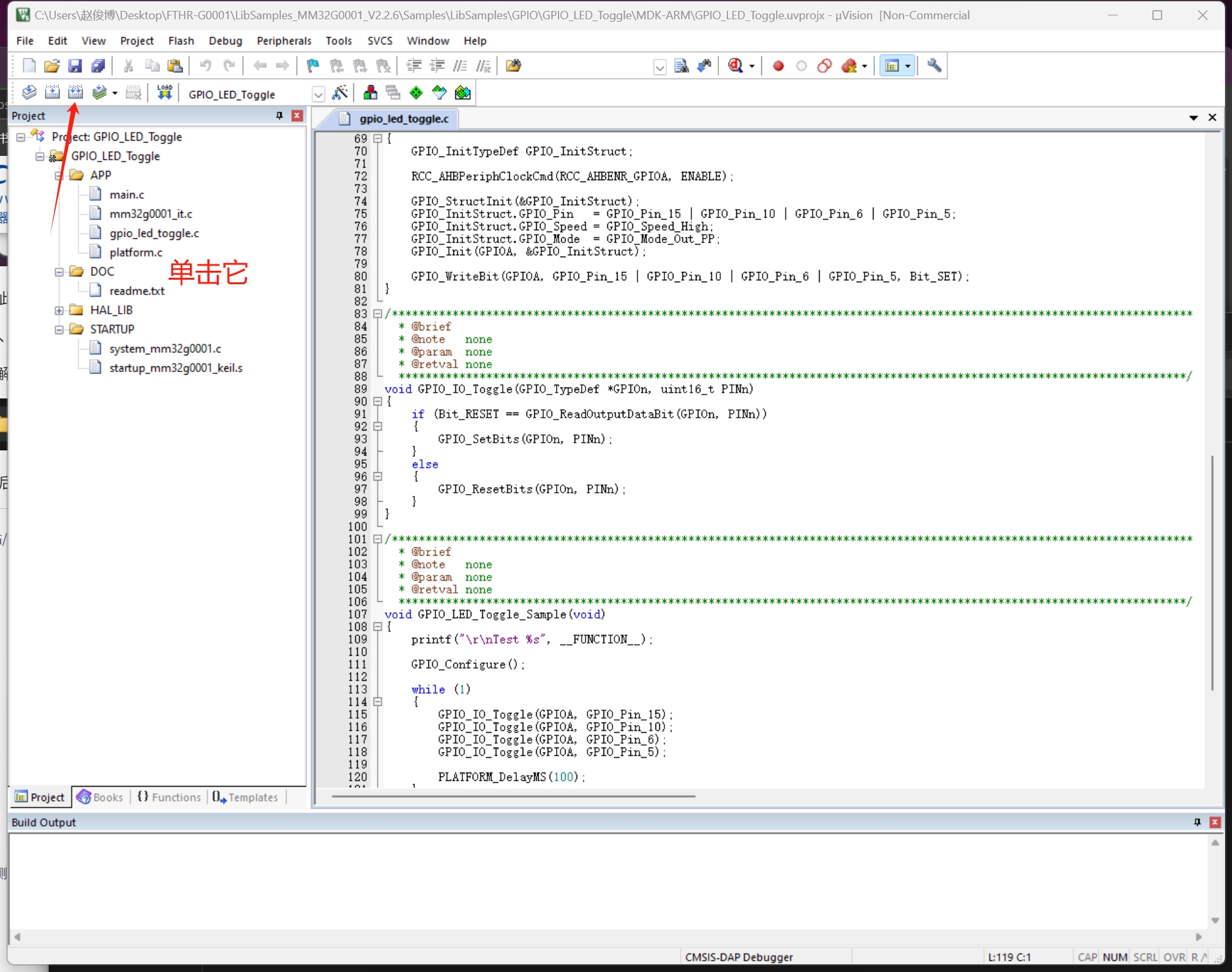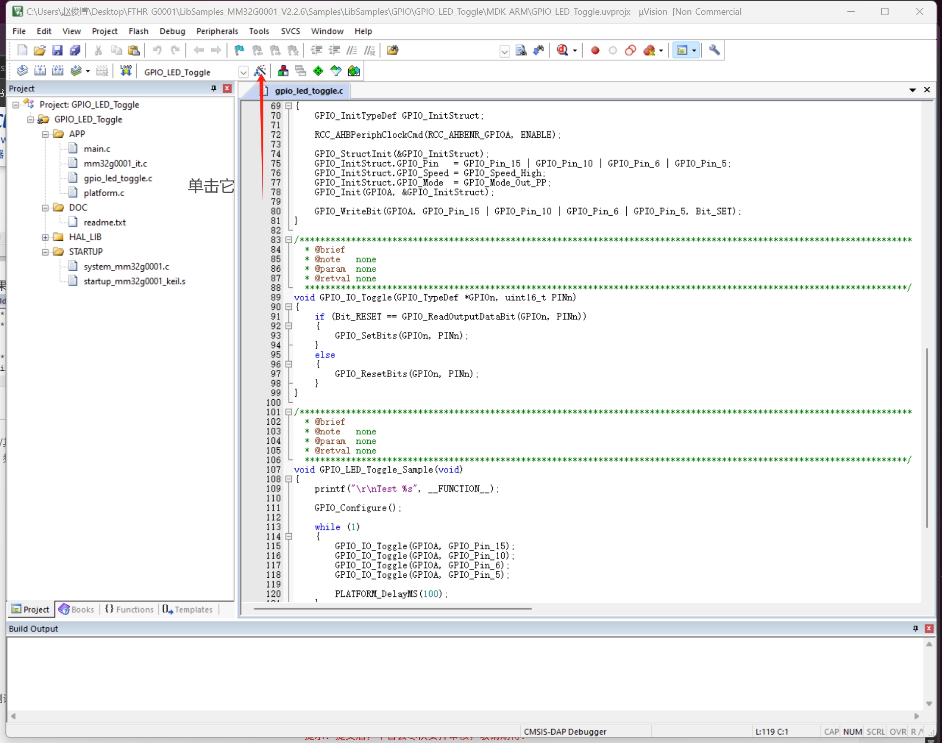 然后根据这个地址(LibSamples_MM32G0001_V2.2.6\Samples\LibSamples\GPIO\GPIO_LED_Toggle\MDK-ARM)找到GPIO_LED_Toggled双击打开进入KEIL5点击编译
