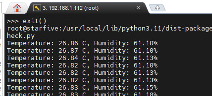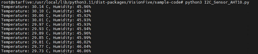 sys.exit(main())保存代码,终端执行指令 python3 I2C_Sensor_SHT40.py ,程序运行,打印输出采集的传感器数据。