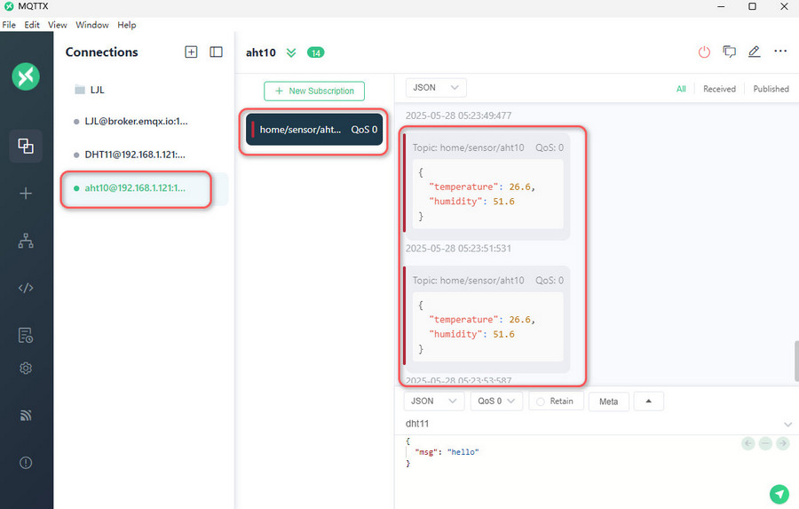 - 在此 MQTT Broker 新建对话主题 home/sensor/aht10 ,即可接收 EMQX 客户端发送的消息