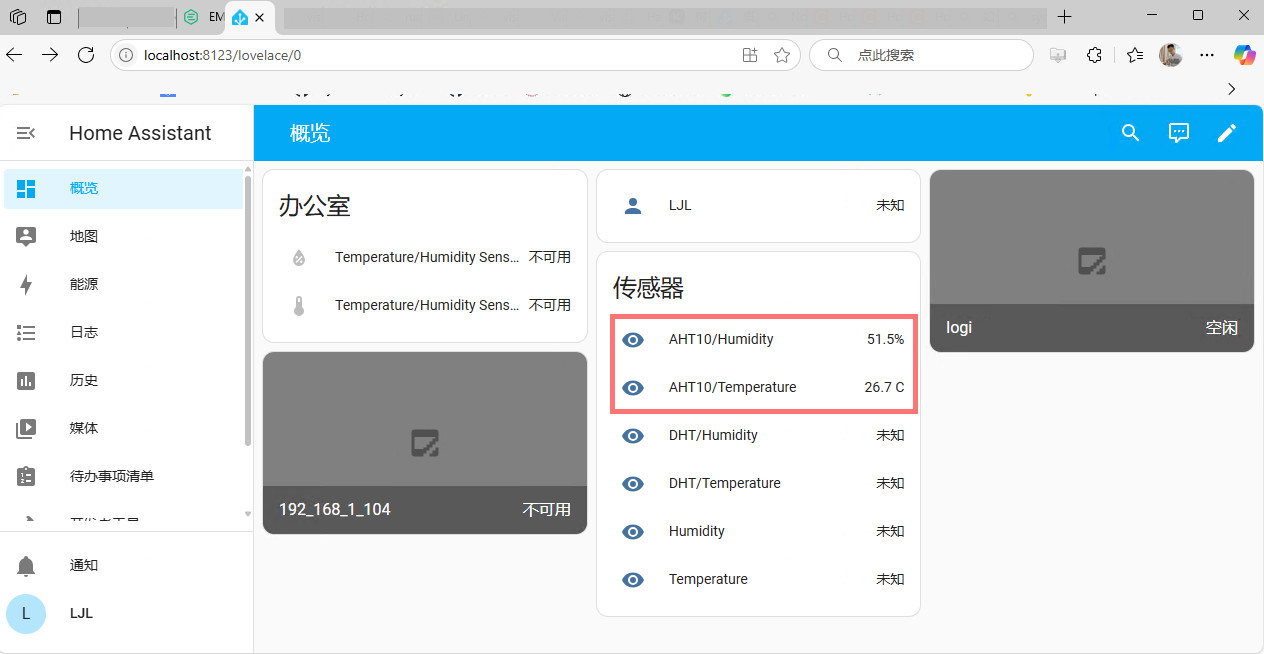 将发送的 AHT10 数据添加至 Home Assistant 平台,实现网页端的 Home Assistant 传感器数据显示。