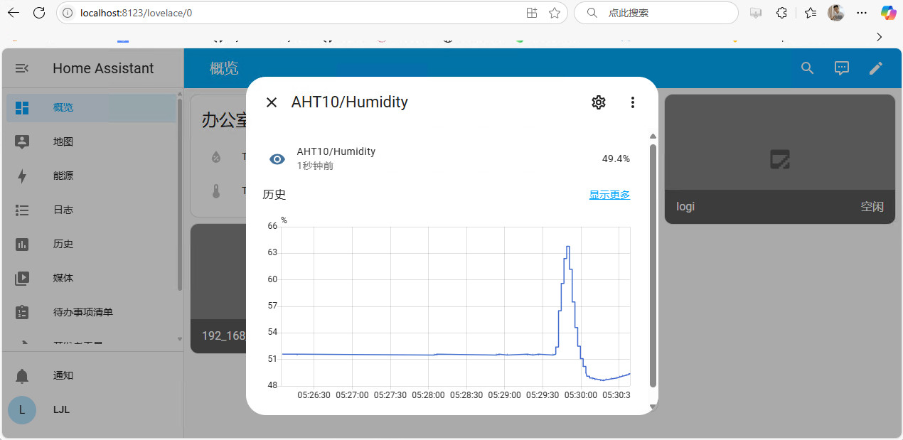 value_template: "{{ value_json.humidity }}"应用配置并刷新网页,可在传感器标签页下找到 AHT10 传感器数据显示