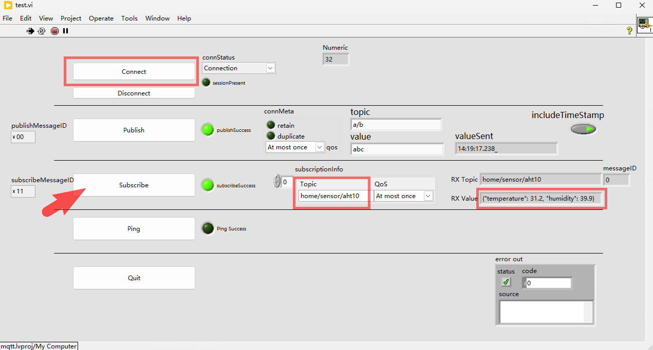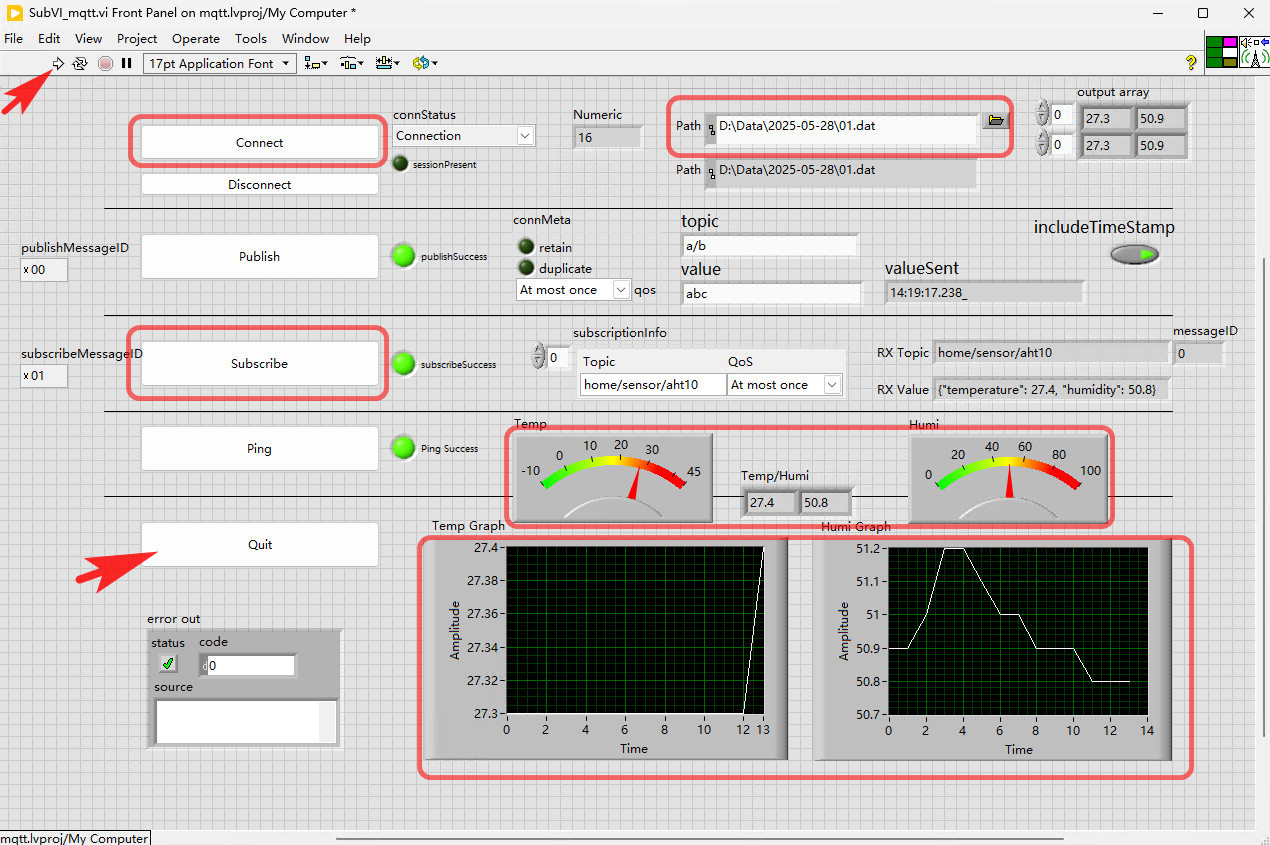 需要说明的是,LabVIEW 上位机可通过串口采集 AHT10 温湿度数据,也可以通过前面的云端上传与 MQTT 协议代理采集数据。