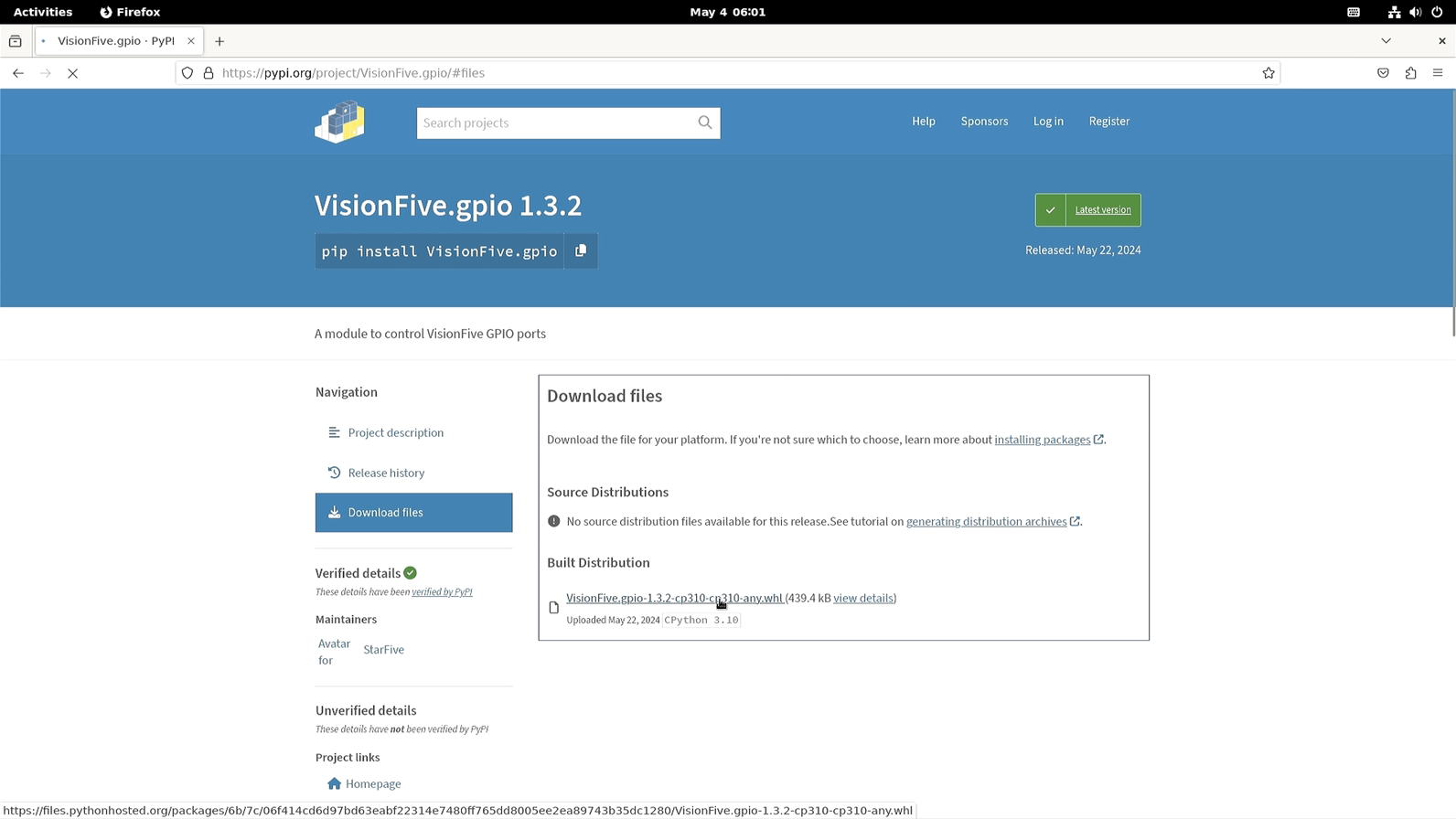 命令直接安装软件包,需要前往 PYPI 下载 VisionFive.gpio