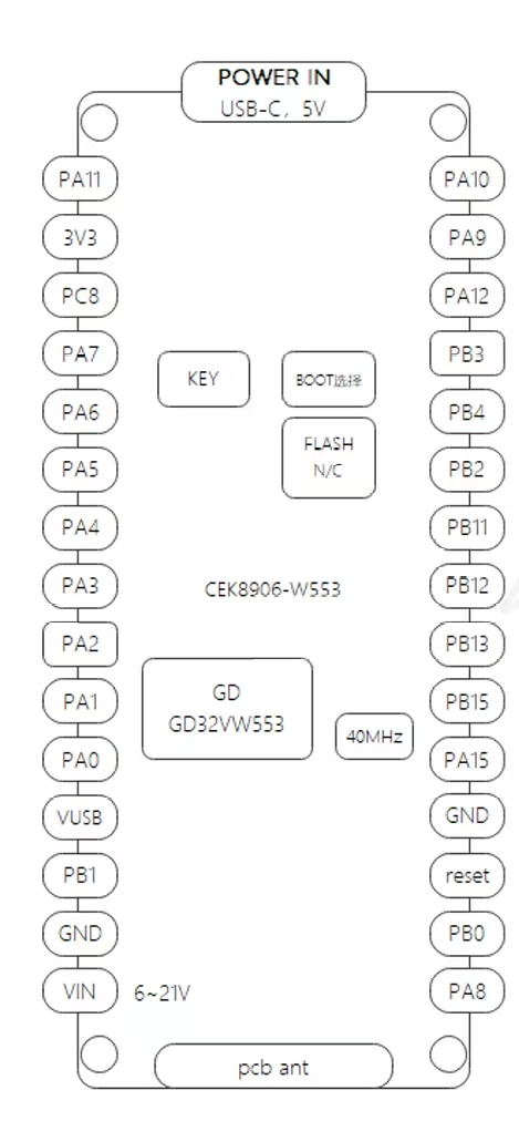 从硬件规格书里面我们可以看到GD32VW553的具体引脚图,在此我将它贴出来