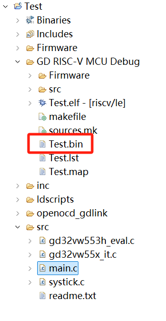 选择编译 编译成功后去查看Test_bin所在位置 可右击查看Properties查看文件具体地址,后面烧录会用到