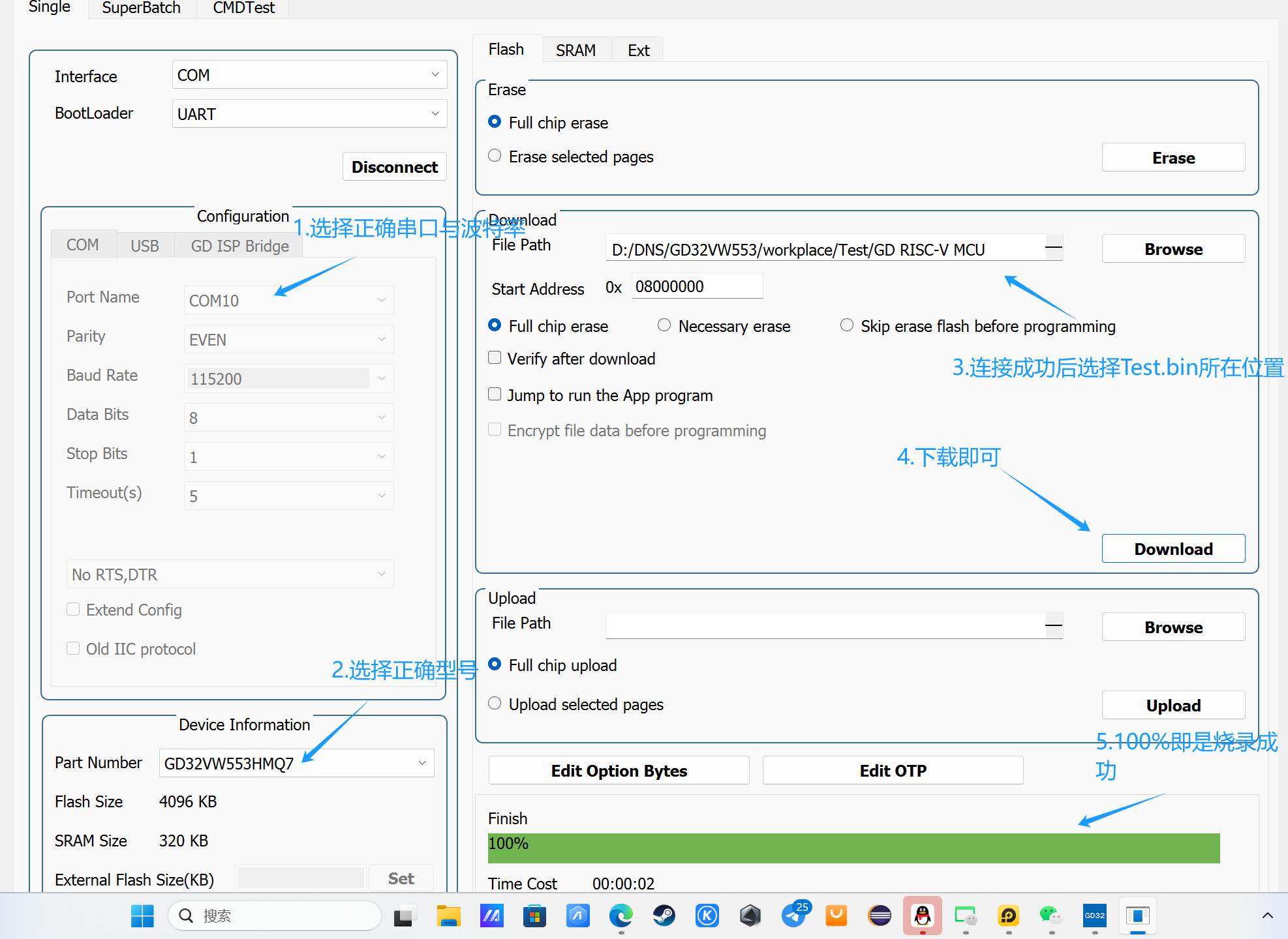 照图示连接好后,打开串口烧录软件GD32AllInOneProgrammer.exe 照图下设置,如果出现连接失败,可能是线接反了,也可能是R4 R5引脚需要焊上,但是我拿到的GD32VW553倒是不需要焊接就成功了