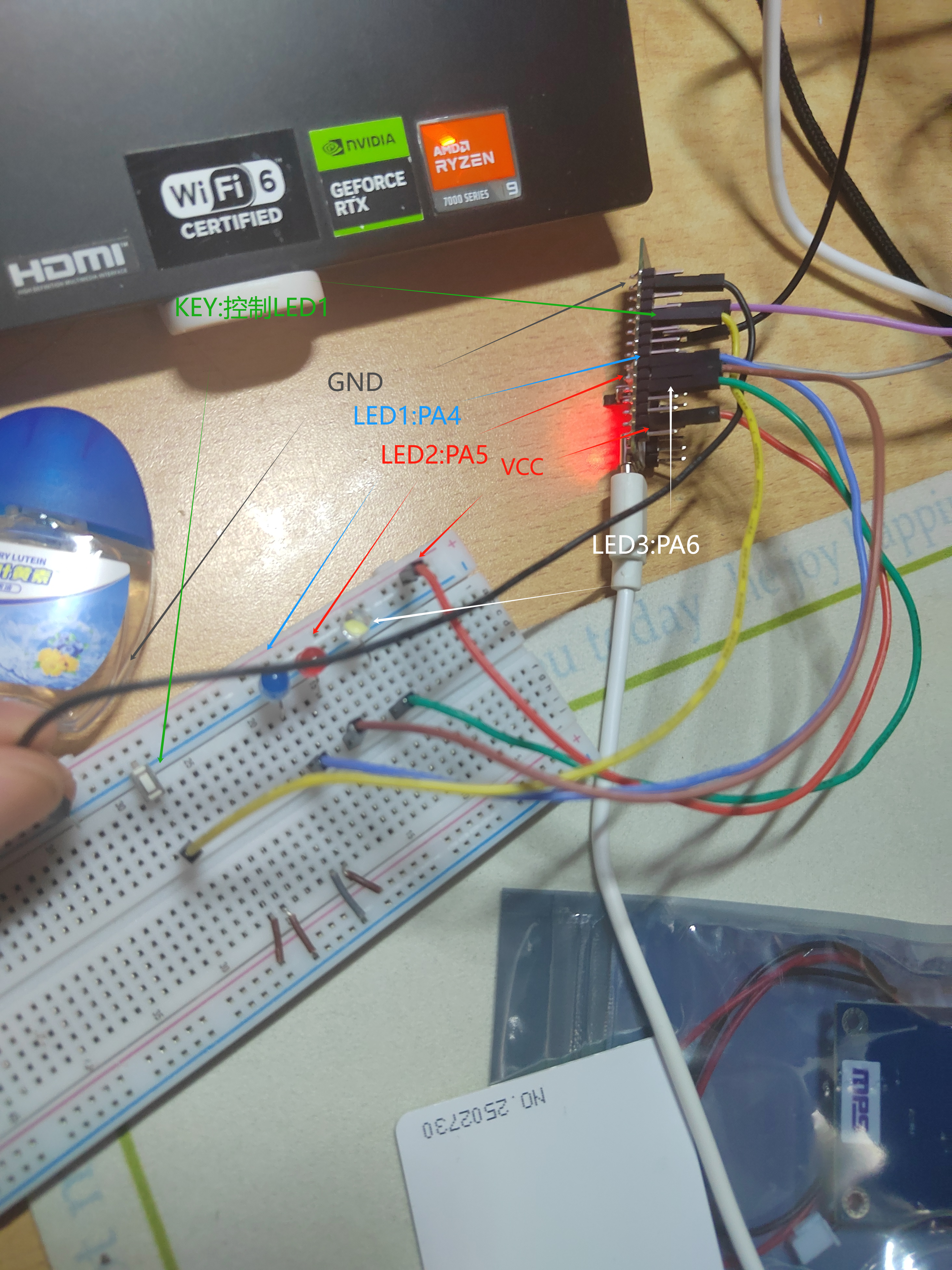 我们可以发现,在示例代码里面的key作用是保持LED1的当前状态,也就是从屏闪的状态转换为一个固定的状态 按下时是灭时则灭 按下时为亮时则亮 而LED2和3则是每秒钟闪烁一次 状态相对固定
