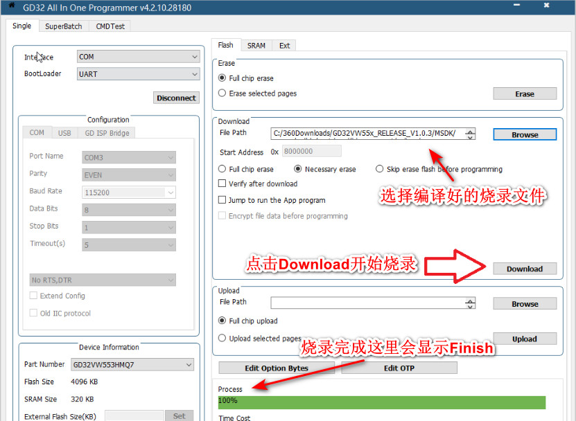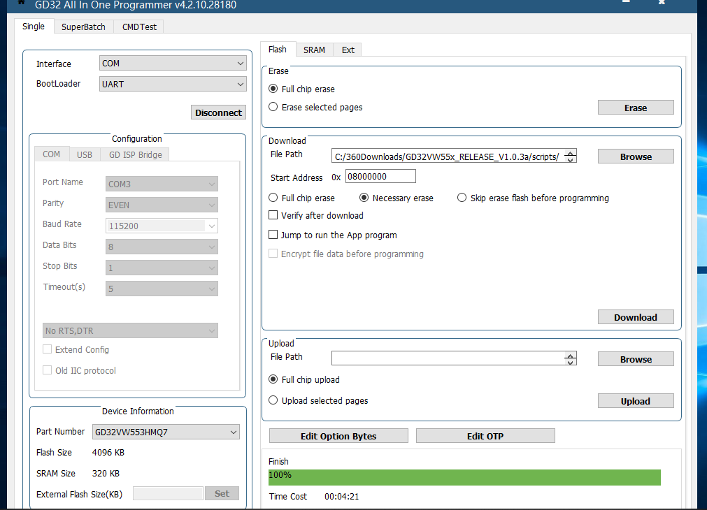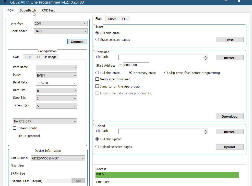 烧录前确保跳帽设置到正确位置,我采用串口烧录方式,用USB转TTL连接开发板对应的PA6和PA7引脚,插入电脑USB接口,将烧录软件左下角Part Number 选择为GD32VW553HMQ7, 然后按下开发板上的复位按钮,点击烧录软件上的connect就能顺利连接开发板,如果出现错误弹窗,检查下接线重新再试。