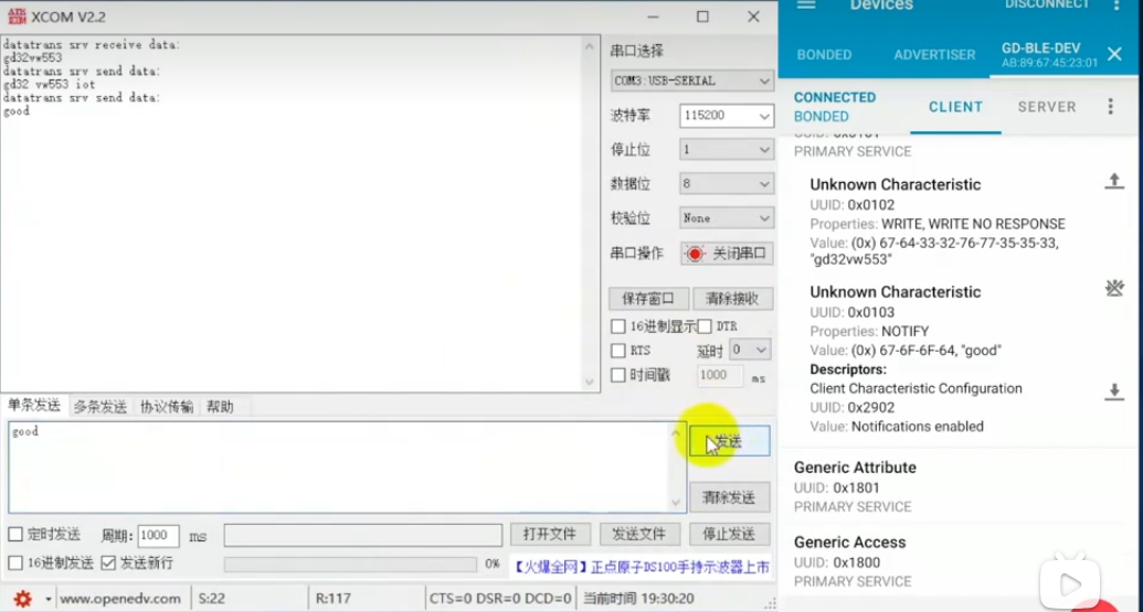 烧录完成后,将root0跳帽复位,打卡串口工具,设置波特率115200,停止位1,数据位8,校验位None,按下开发板上复位按钮,串口工具会显示服务启动,此时可以打开手机蓝牙和定位,搜索并连接GD-BLE-DEV这个设备,之后就是数据传输测试,可以看到,通过串口工具向手机发送的数据手机都能正常接收到,手机发送的数据,通过串口接收区也能看到,至此,萤火工场的这款单片机的 官方蓝牙透传示例 顺利完成实际测试。