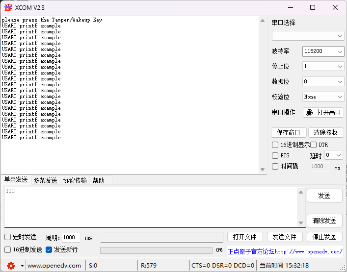 打开串口助手发现不能通信,需要先关闭下载软件串口,打开串口助手发现不能通信 然后打开程序发现他配置的是串口0,使用的A8 B15 按键是A0