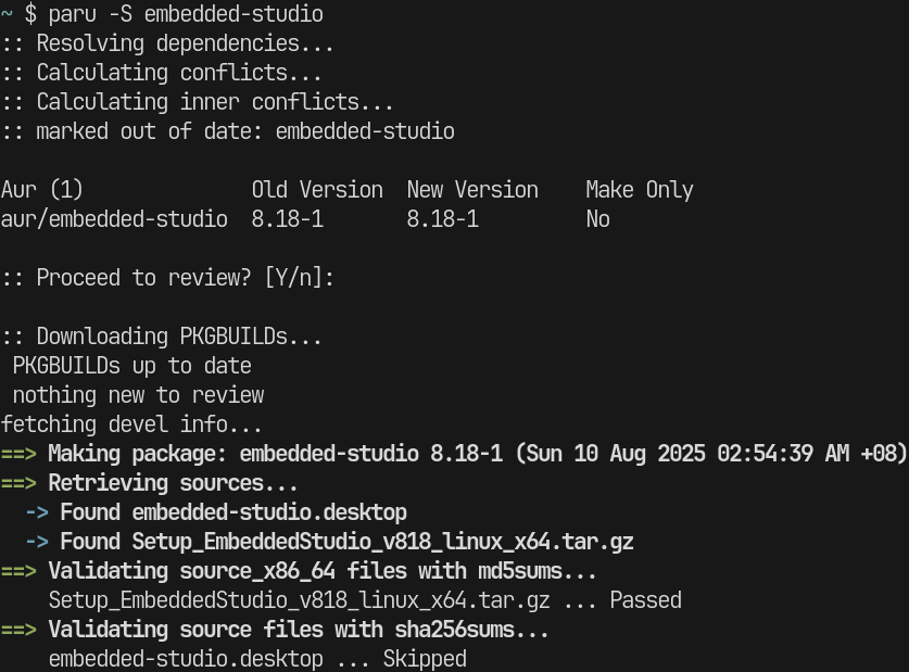 Linux hydrogen 6.15.6-arch1-1 #1 SMP PREEMPT_DYNAMIC Thu, 10 Jul 2025 17:10:18 +0000 x86_64 GNU/Linux笔者使用的环境是 Arch Linux,GD 官方的 Embedded Builder 只提供了 Windows 上的二进制可再分发包,因此我们要想办法变通. 考虑到 GD 和 SEGGER 有合作,同时也是 GD 官方推荐的方式之一,我们不妨在 Linux 上使用 Embedded Studio;当然了,Windows 上也是可以使用 Embedded Studio 的.