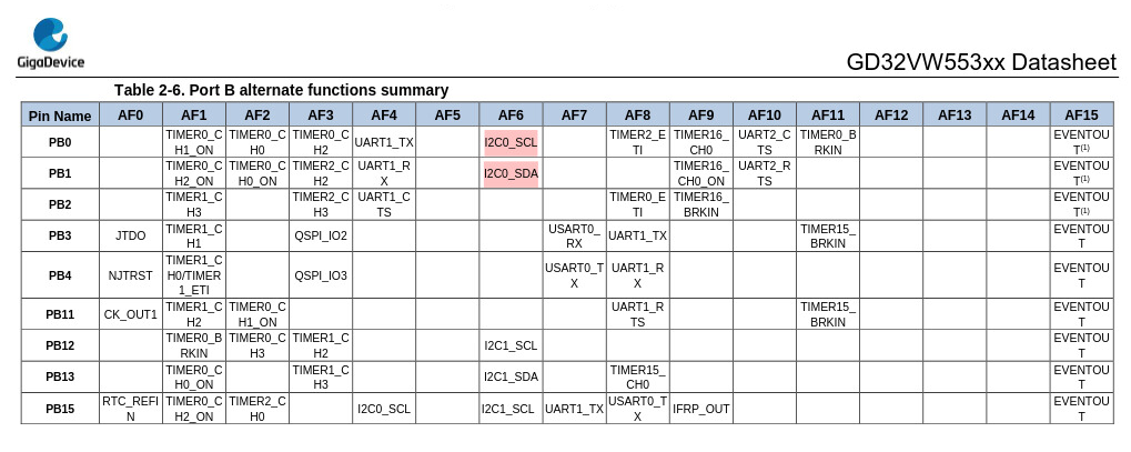 我们需要对引脚的 IOMUX 功能进行初始化,可以参考官方数据手册的 IOMUX 矩阵,同时以下初始化过程也参考了 GD32VW55x 里的 AT24 EEPROM 读写例程. 这里使用了 PB0 和 PB1 作为 SCL 和 SDA.