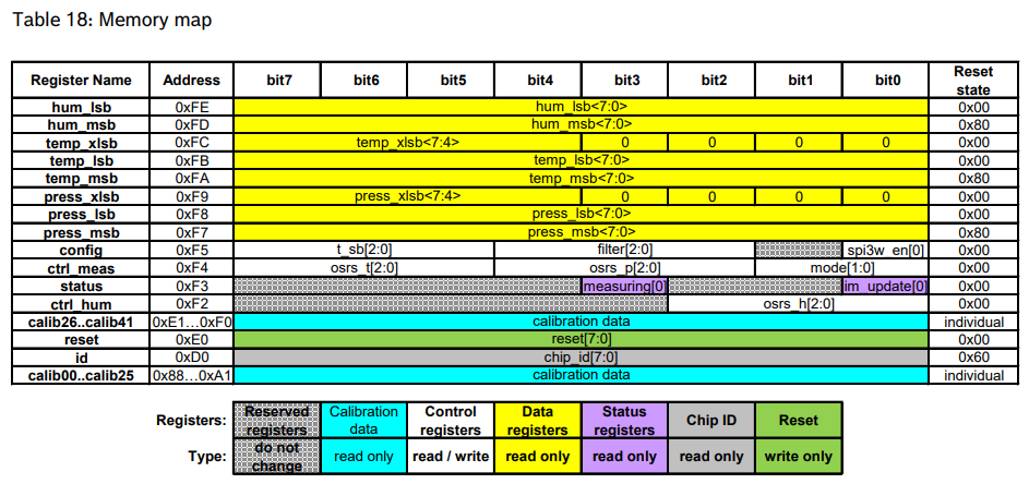 BME280 的寄存器表如上图所示,因为携带了校正表,我们不能简单地将数据读出并量化. 不过无论如何,在读取数据前,我们首先需要配置采样率等信息: