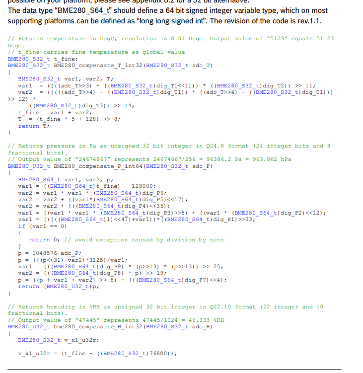 手册中分别包含了定点数和浮点数系统的校正算法,这里我们采用定点数的算法,因为环境监测相关的 BLE 服务规范中也使用的是定点数,不过量化标准有所不同,这样做可以避免反复转换丢失精度.