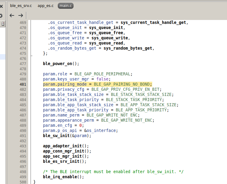 为了方便,我们将原先 BLE_APP_UART 例程的配对模式改为 NO_BOND 因为我们不需要持久化对端的信息.
