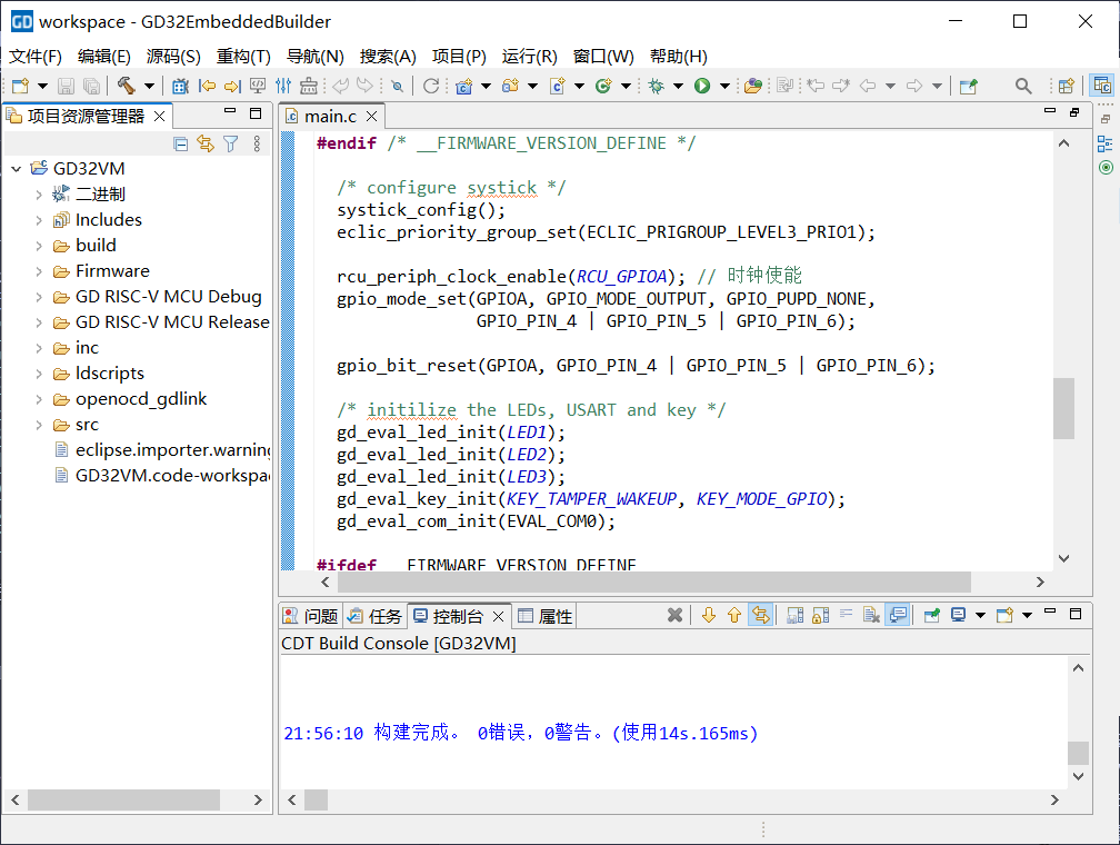 下载好里面的资料就可以直接开始使用了.没错!!!这个IDE居然是即开即用,比罐头都方便?。因为是基于Eclipse二次开发的,IDE本身是英文的,但是我们可以通过下载插件来进行汉化。选择好芯片创建好工程,就可以正常的进行编码了,用它的模板编译一下。