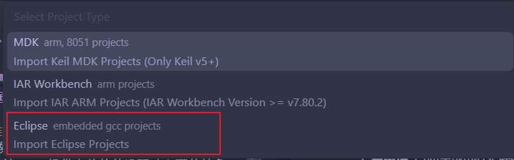 如果不喜欢这种界面,也可以通过VsCode的EIDE插件来进行项目的导入,按照提示导入项目中的 .cproject 文件,我们可以自动创建一个VsCode项目。